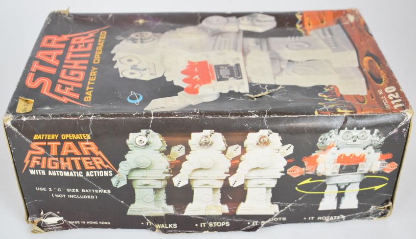 Two battery operated plastic body 'Star Fighter' robots by New Bright (Hong Kong), height 25cm, one in original box.