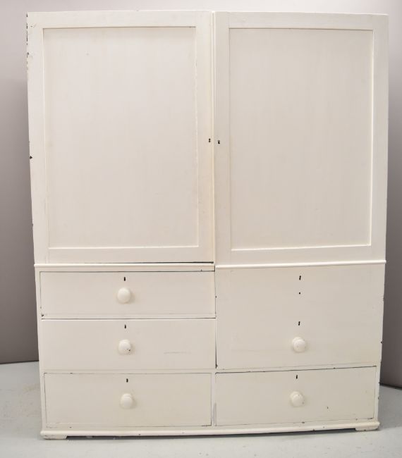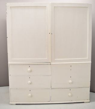 19th or early 20thC painted pine housekeeper's or linen cupboard with three drawers to base and cupboards to top, W152 x D50 x H187cm
