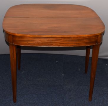 19thC mahogany crossbanded and inlaid rope twist edge fold over card table raised on square tapering legs, W92 x D44 x H73cm