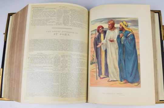 [Bindings] The Illustrated National Family Bible with the Commentaries of Scott & Henry containing many thousand Critical & Explanatory notes by Rev. John Eadie published National Bible Supply (c.1880s) with colour illuminated title and many full-page chromolithographed plates and maps, a folio volume in a full heavy morocco binding with raised centre piece and gilt decoration front cover raised bands with gilt spine and ornate metal corner-pieces with metal clasps. The Holy Bible, published Oxford & Henry Frowde 1897 with engraved plates in heavy morocco embossed binding with gilt titles and metal clasp (2)
