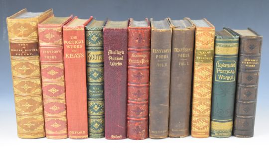 [Bindings] Works of Tennyson 1884 in full gilt morocco. Poems of Tennyson in gilt decorated tree calf. Poetical Works of Longfellow in decorated cloth. Poems of Cowper 1864 with steel engravings in heavily stamped morocco. Tennyson’s Poems 1860 in 2 volumes. Gleanings from The Poets with steel engravings. A Thousand and One Gems of English Poetry by Charles Mackay in full gilt calf, together with volumes of Keats, Walter Scott & Shelley (11)