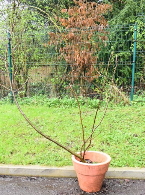 Large specimen tree in planter probably a fig / ficus 'Brown Turkey', height 155cm