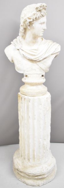Classical style bust of a man draped in a robe, on socle base sitting upon a reeded column, overall height 177cm