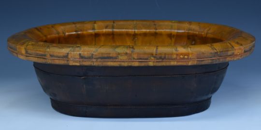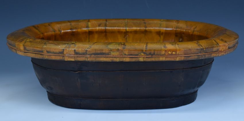 19th / 20thC Chinese twin handled baby's bath in two parts bound with rope twist copper wire and of oval tapering form, W59 x D39 x H38cm