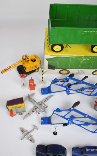 A small collection of  Dinky, Matchbox and Ertl cars, planes and farm vehicles to include vintage examples, Austin Taxi 254, Chivers Jellies Trojan Van 452 and Loud Speaker Van 492, some in original boxes.
