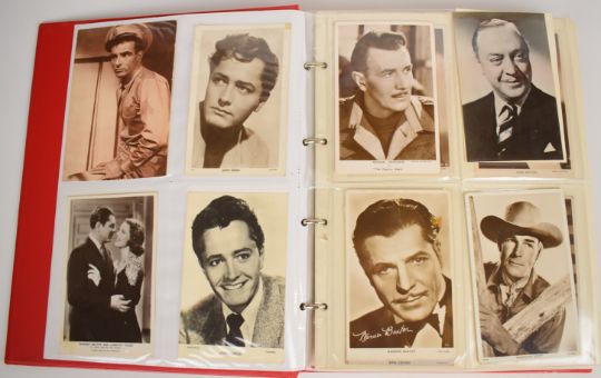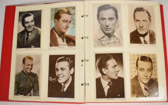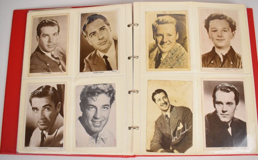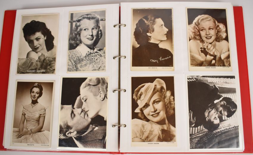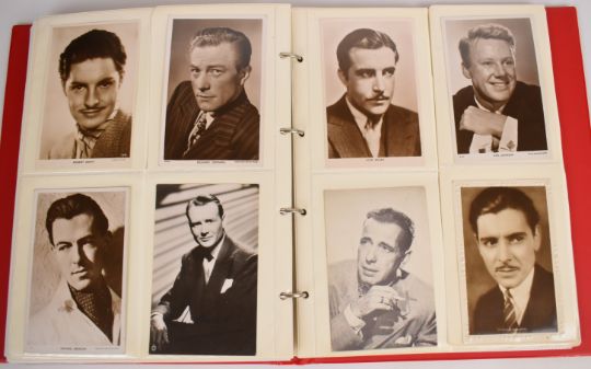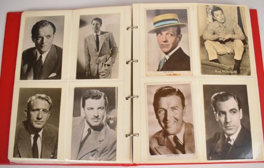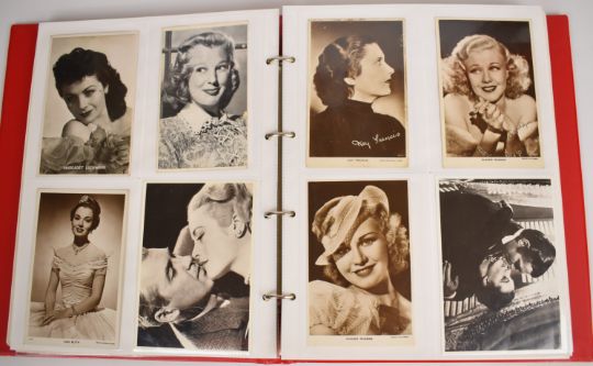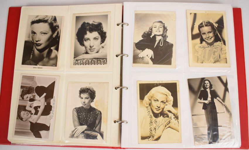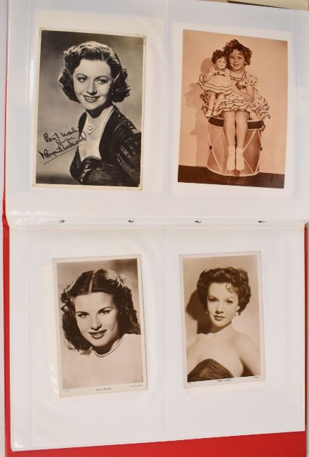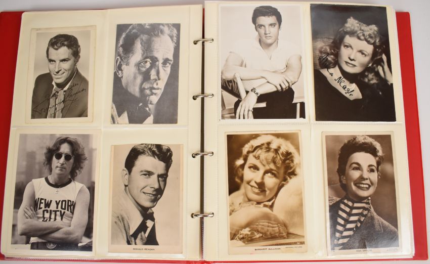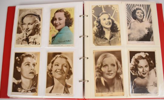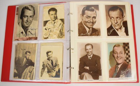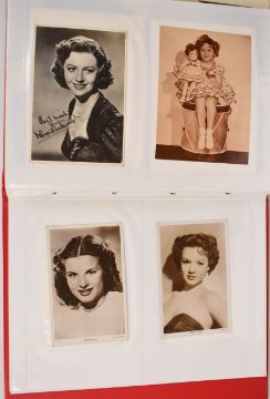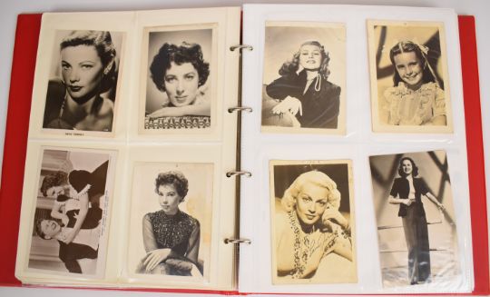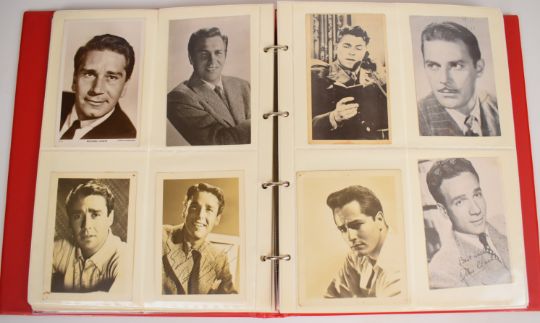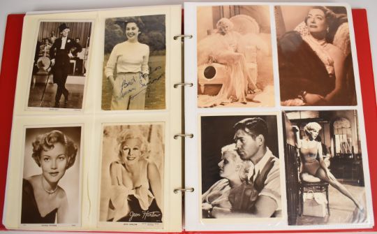 Album of promotional cards for stage and screen, some signed, approximately 260 cards including Marilyn Monroe, Gary Cooper, Shirley Temple, Elizabeth Taylor, etc
