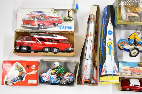 Seven tinplate clockwork toys, mostly Chinese and Russian, to include space rocket, double decker bus and motorcycle with sidecar, all in original boxes.