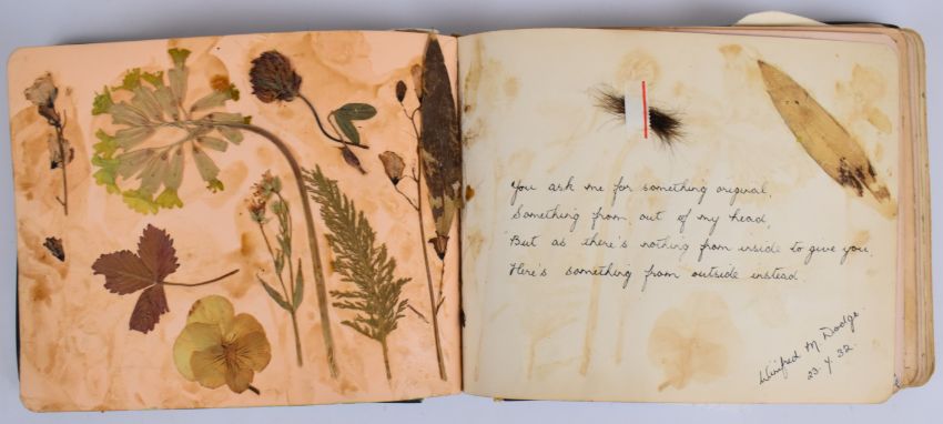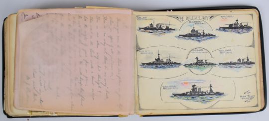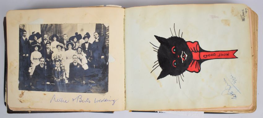 Edwardian / WW1 and later album of cuttings, missives, photographs, watercolours including naval vessels, etc connected to several Welsh families from Swansea / Neath including Welch, Jones c1883 onwards (list inside cover), Fragments From Bairnsfather, pressed flowers etc