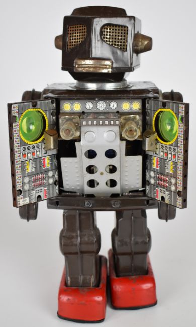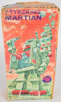 Japanese battery operated tinplate 'Attacking Martian' robot by Horikawa (SH Toys), height 28cm, in original box.