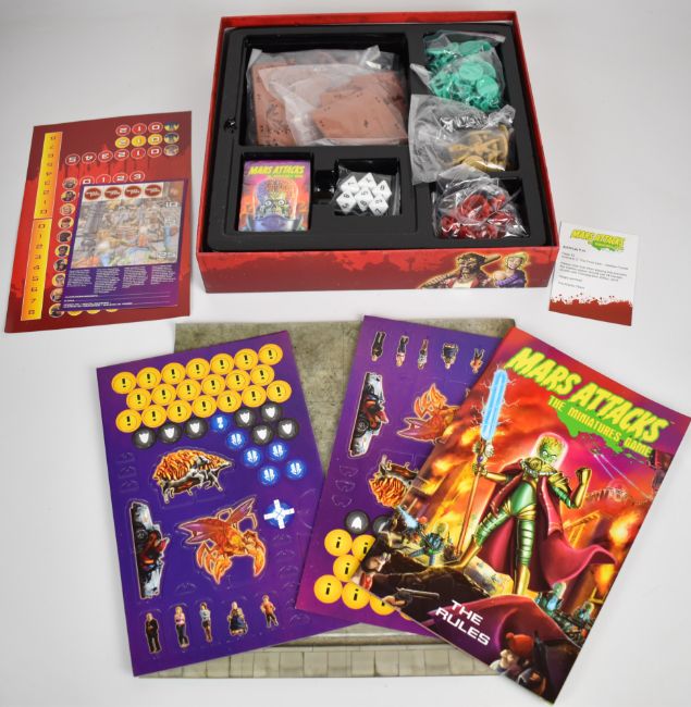 Mars Attacks The Miniatures Game by Mantic Games, unused in original box with figurines, dice, battle cards, rulebook etc.
