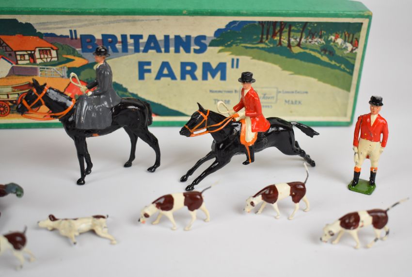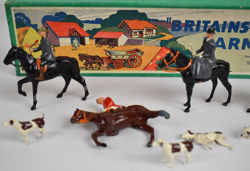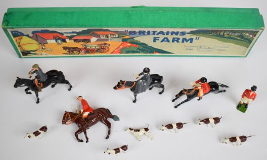 Britains vintage lead hunting party figures comprising four mounted, one on foot and six hounds, 1446, in original box.
