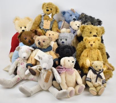 Sixteen artist / studio Teddy bears including Robin Rive, Hazeley Bears, Cotswold Bear Co and Beryl Stopgate, tallest 50cm