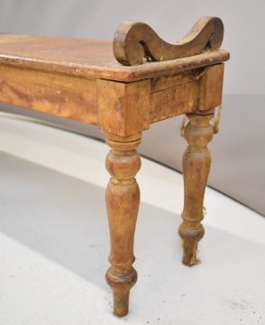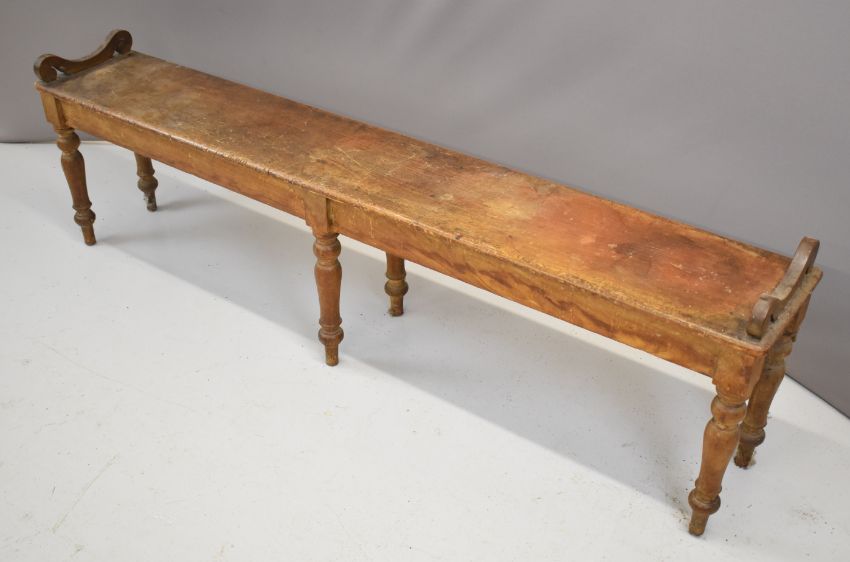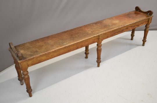19thC ash window seat or low bench with scroll ends, raised on six turned legs, W193 x D30 x H46cm
