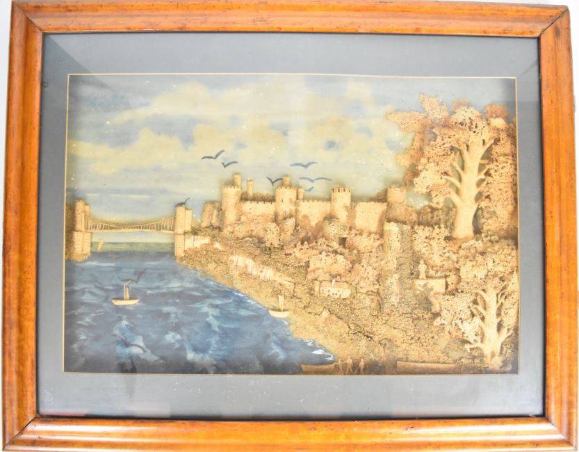 A 19thC cork picture of Conway Castle in satinwood frame, 37 x 50cm (58 x 71cm overall)