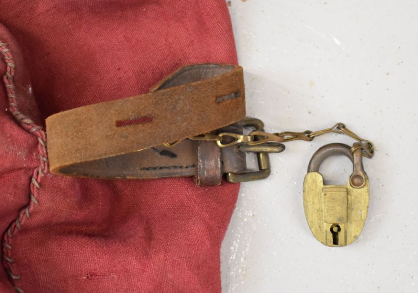 Three red canvas post or parcel bags with metal hanging loops and Post Office Bath to sides, one dated 1936, one 1956, the other undated, height 122cm, together with two further smaller bags and a GPO hessian sack, being sold by the now closed Bath Postal History Museum