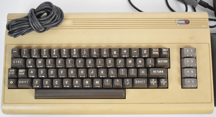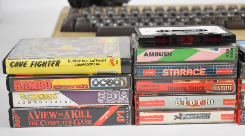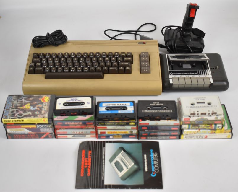 Commodore 64 retro gaming system together with power supply, cassette deck, joystick and a collection of games including Buck Rogers, Rambo First Blood Part II, A View To A Kill, Wing Commander and Cave Fighter.