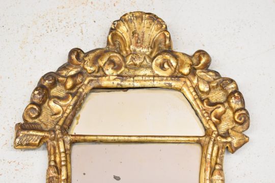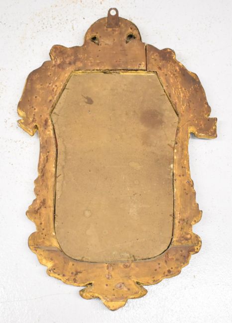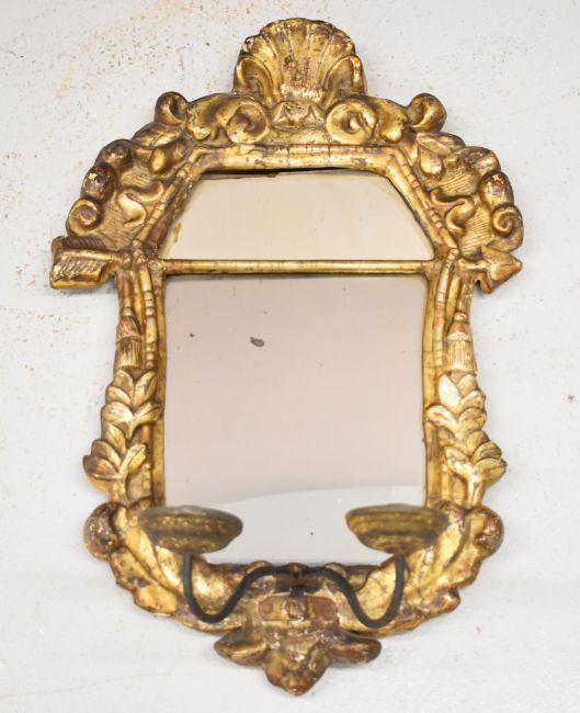 18th / 19thC likely Regency gilt wood pier mirror with blacksmith made iron double candle sconce, width 45 x height 67cm