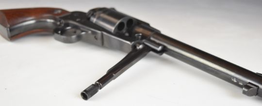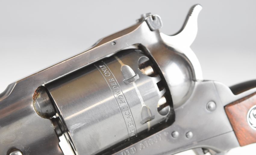 Ruger Old Army .44 six-shot single action revolver with shaped wooden grips, adjustable sights and named 7.5 inch barrel, overall length 36.5cm, serial number 145-83005, in fitted case with powder flask and percussion caps. PLEASE NOTE THAT A VALID RELEVANT FIREARMS/SHOTGUN CERTIFICATE IS REQUIRED TO HANDLE/PURCHASE THIS ITEM.