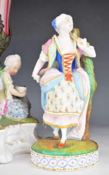 19thC German figural porcelain centrepiece with overlaid, cut and gilded flared glass insert, together with two bisque figures