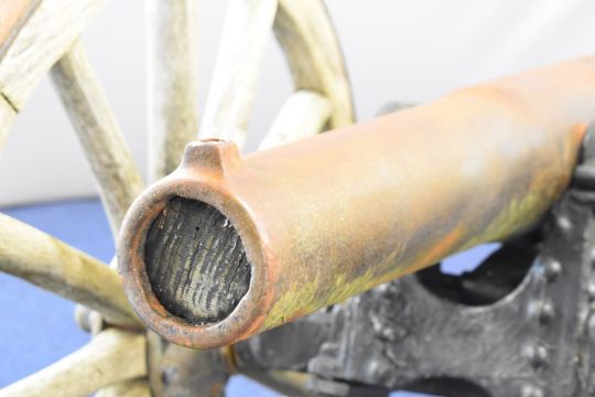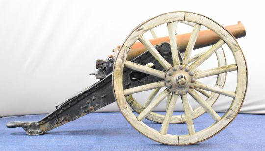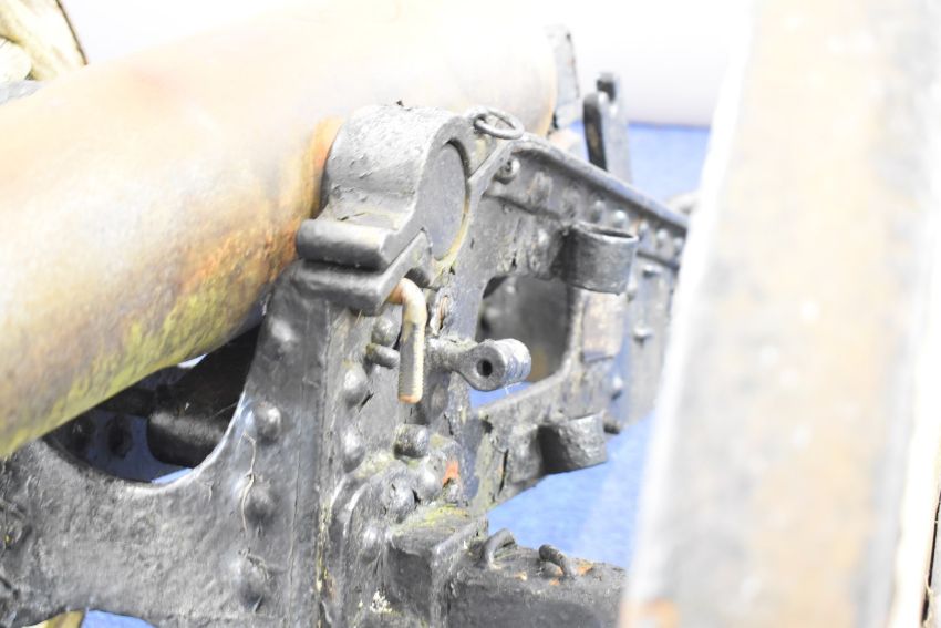 British Mark IV steel 7-pounder 200lbs RML (rifled muzzle loading) gun. The 40 inch graduated barrel with indistinct crown topped roundel to the first reinforcement, pierced knob shaped cascabel and riffled bore raised on black painted riveted iron carriage with wooden spoked wheels, iron rims and cast bronze hubs. The carriage with hinged storage compartment and set with a plaque marked '7Pr 200Lbs R.M.L. Gun WD I.R.C.D 1882 Reg No 131 Wt Carrge Lbs 2.0.12 Wheels 1.1.4 Total 3.1.16’, overall length 197cm, width 92cm. This gun is being sold on behalf of The Portishead Nautical Trust and was previously the property of the National Nautical School. The gun comes with related paperwork including letters from the trust and The Royal Armouries and with images of the gun being used on parade.