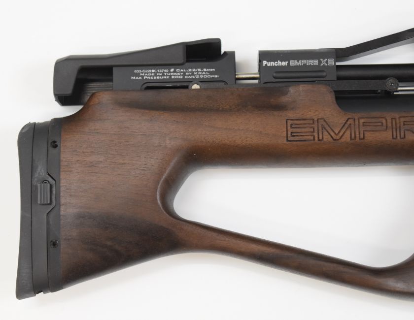 Kral Puncher Empire XS .22 PCP carbine air rifle with textured pistol grip, two 14-shot magazines and scope rail, serial number 633-G22HK-13740, in original box with instructions and accessories.