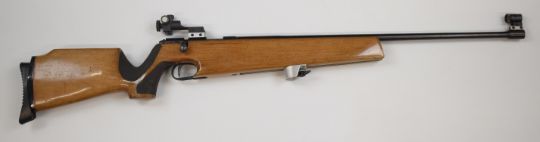 Companhia .22 bolt-action target rifle with textured semi-pistol grip, raised cheek piece, sling mounts, adjustable butt plate, CBC fully adjustable target sights and 26 inch barrel, overall length 110cm, serial number 2444. PLEASE NOTE THAT A VALID RELEVANT FIREARMS/SHOTGUN CERTIFICATE IS REQUIRED TO HANDLE/PURCHASE THIS ITEM.