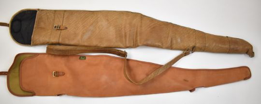 Six various shotgun or shooting accessories comprising two leather cartridge bags, two gun slips, a fitted carry bag and a 12 bore shotgun cartridge belt.