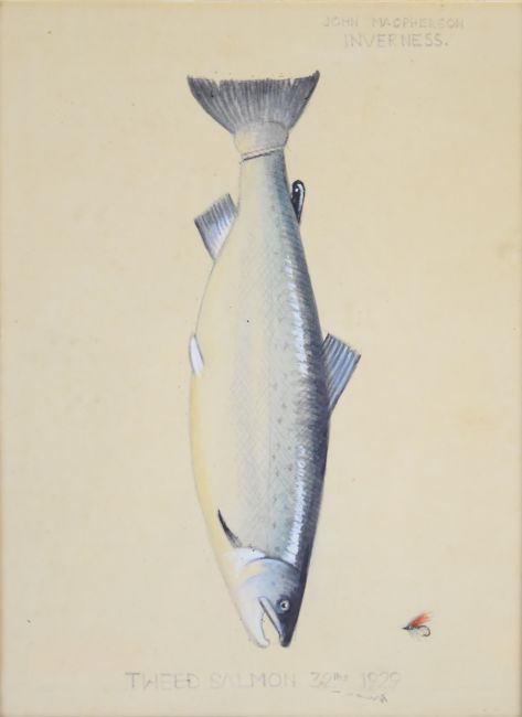 John Macpherson, Inverness (19th/20thC taxidermist) watercolour study of a fish 'Tweed Salmon 32lb 1929', named top right 19 x 14cm, in part gilt frame
