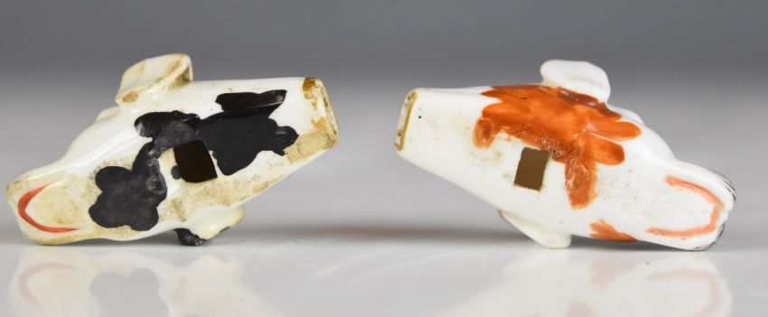 Two 19thC porcelain dog Worcester / Derby whistles, longest 5cm