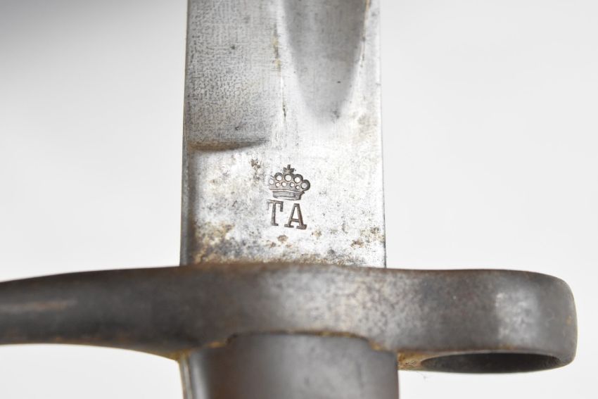 Italian 1870 pattern Vetterli bayonet with wooden grips, external leaf spring, TA to ricasso, 52cm fullered single edged blade, scabbard and later frog. PLEASE NOTE ALL BLADED ITEMS ARE SUBJECT TO OVER 18 CHECK ON COLLECTION OR DELIVERY