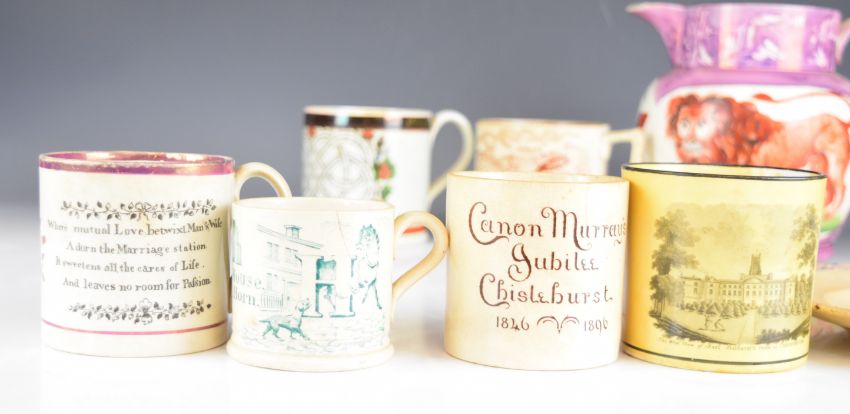 Collection of 19thC transfer printed cups, mugs and tankards, many featuring dogs, nursery ware, Cirencester, Glass House, Mill School, Hopton Methodist Sunday School and Franklin's Maxims, Stockport Sunday School plate, Sunderland lusterware, Masonic jug Wrights and Coopers Society, Cromarty
