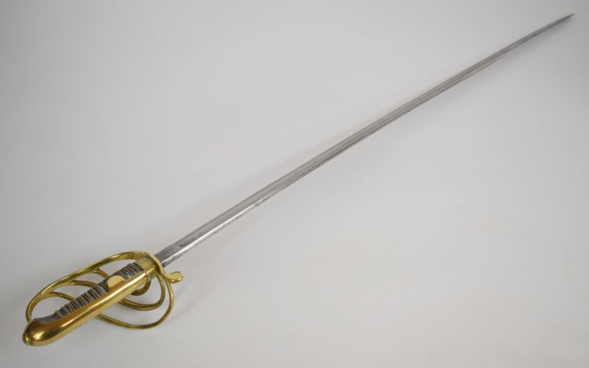 Continental sword with four bar brass hilt, shagreen and wire grip and 70cm curved blade. PLEASE NOTE ALL BLADED ITEMS ARE SUBJECT TO OVER 18 CHECK ON COLLECTION OR DELIVERY