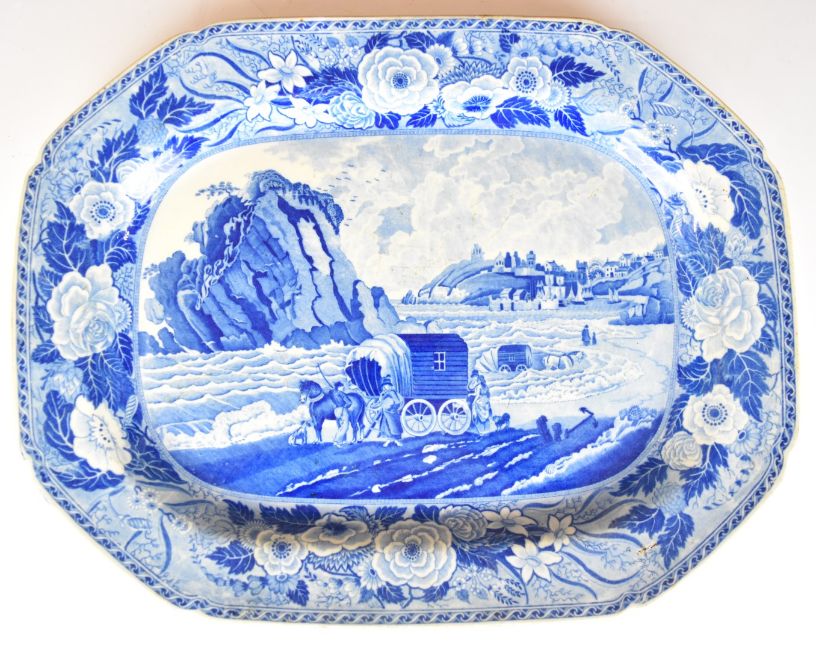 19thC blue and white transfer printed meat platter with decoration of Monks Rock, Tenby, probably Minton, the scene based on an engraving by S Middiman from the original by Julius Caeser Tibbetson (See Tenby Museum website for an identical example)