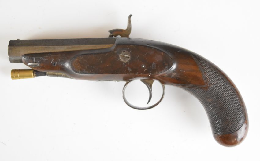 Bentley of London 36 bore percussion hammer action coat pistol with engraved lock, hammer, trigger guard and mounts, chequered grip, brass tipped wooden ram-rod, vacant brass wrist cartouche and named 4 inch smooth bored octagonal barrel, overall length 23cm.