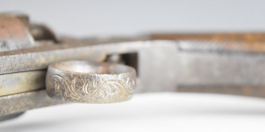 Belgian 54 bore six-shot self-cocking percussion revolver with ring trigger, engraved frame and butt cap, chequered grip and 7 inch octagonal barrel, overall length 35.5cm.