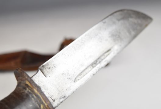 Hunting knife with leather grip, 15.5cm single edged blade and leather sheath, together with military style clasp knife. PLEASE NOTE ALL BLADED ITEMS ARE SUBJECT TO OVER 18 CHECK ON COLLECTION OR DELIVERY