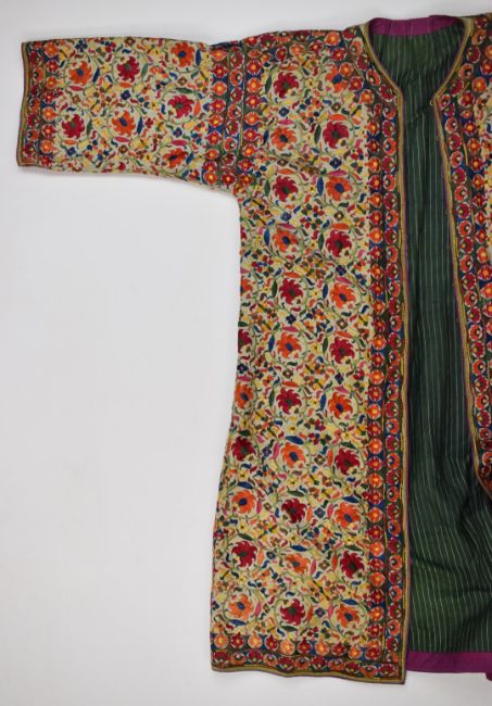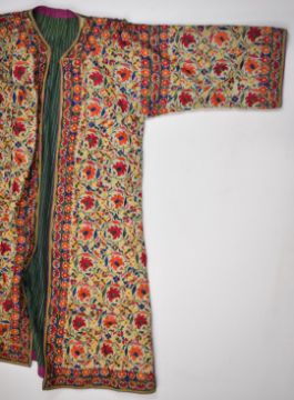 19th / 20thC Indian embroidered coat or coat dress, with a note stating the coat was gifted in the late 1940s after partition by the last Mir of the Talpurs (Sind province). Note states the coat to be early 1800s, in our opinion, more likely late 19th / 20thC, length 114cm. Please see photograph of the note, images online show the last Mir wearing a similar coat, but not this garment.