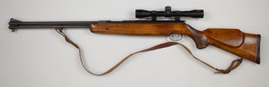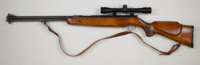 Weirauch HW77 .22 underlever air rifle with chequered semi-pistol grip, raised cheek piece, leather sling, adjustable trigger and Nikko Stirling Gold Crown 4x32 scope, serial number 1037648.