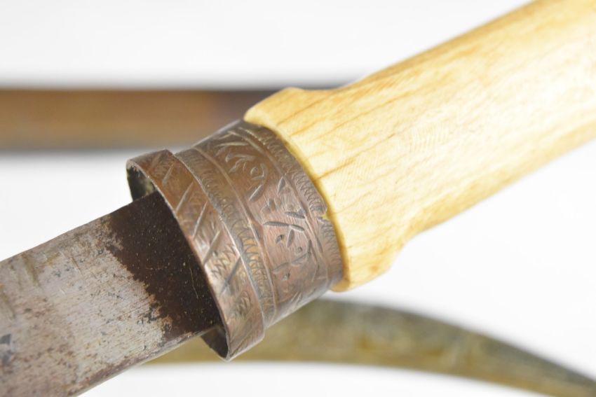 Two Jambiya daggers, the larger example with bone or similar grip and 22.5cm blade, the other of brass construction with bone or similar grips and decorated half scabbard. PLEASE NOTE ALL BLADED ITEMS ARE SUBJECT TO OVER 18 CHECK ON COLLECTION OR DELIVERY