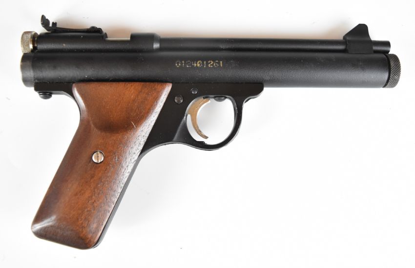 Crosman Benjamin Model E9A .22 COair pistol with wooden grips and adjustable sights, serial number 012401261, in Benjamin EB22 box.
