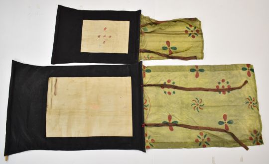 Two Indian watercolour scroll paintings laid on embroidered fabric, largest 105 x 65cm
