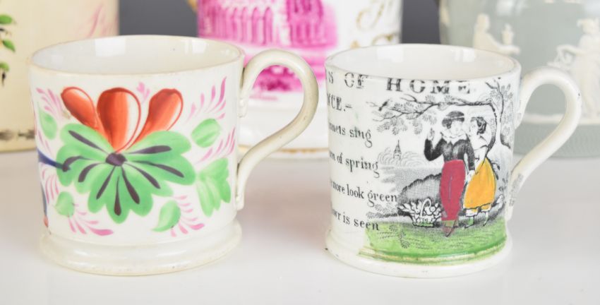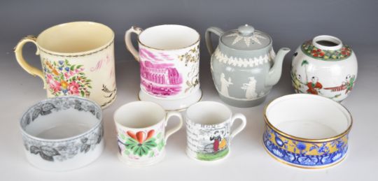 19thC porcelain Copeland teapot with Bill Coles Collection label, Georgian porter mug with William Ibbersen, Batley 1827, Copeland dishes, Chinese ginger jar etc, tallest 12cm