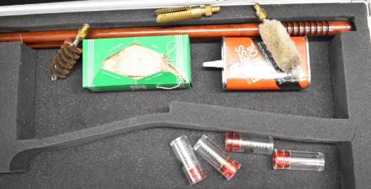 Shotgun or rifle hard carry or flight case with code locks, together with a T E Wood & Son cleaning kit in fitted mahogany box.