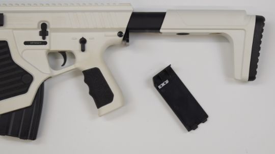 Crosman ST-1 .177 semi-automatic assault style air rifle with white composite body, tactical stock, pistol grip, multi-shot magazine, scope rail, red dot scope and sound moderated barrel, serial number 23F042623, in original box.