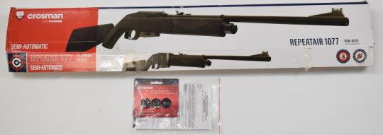Crosman Repeatair 1077 repeater .177  COair rifle with chequered semi-pistol grip, composite stock, adjustable sights and four 12-shot magazines, serial number 822B00264, in original box with instructions.