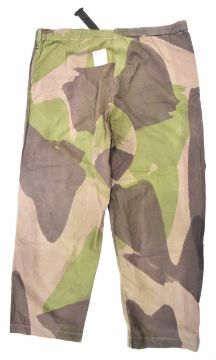 British WW2 SAS windproof camouflage trousers with single front pocket, cloth ties, external label Miller & Co, London and broad arrow mark, dated 1944, size No 2