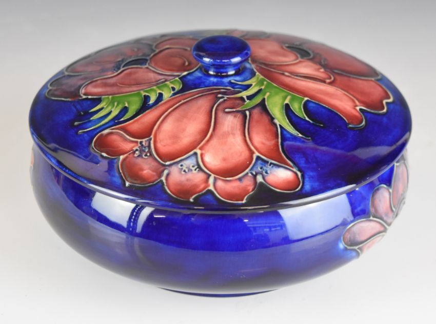 Moorcroft covered dish decorated in the Anemone pattern, diameter 18 x height 10cm