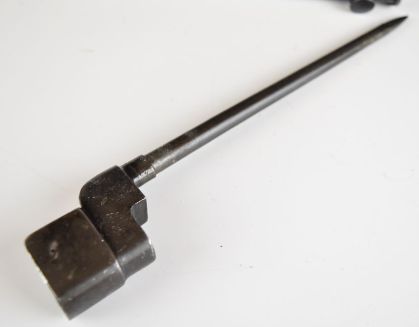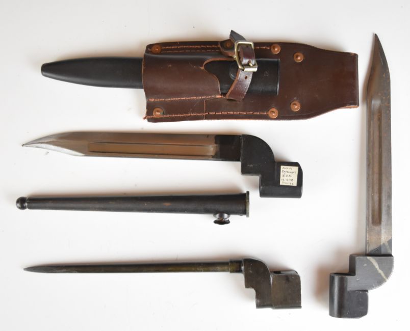 Three British WW2 bayonets No 9 Mk I, two with scabbards, one with frog. PLEASE NOTE ALL BLADED ITEMS ARE SUBJECT TO OVER 18 CHECK ON COLLECTION OR DELIVERY