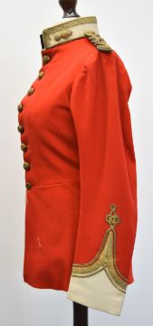 British Army Lancashire Fusiliers officer's scarlet tunic, rank insignia to shoulder cords, regimental white facings, bullion collar badges and associated buttons