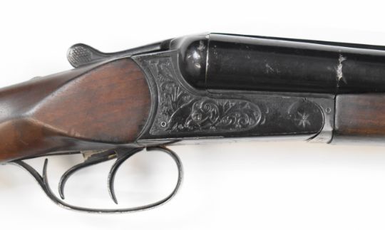 Baikal IJ-58 12 bore side by side ejector shotgun with heavy engraving of birds to the locks, chequered semi-pistol grip and forend, double trigger and 28.5 inch barrels choked ¾ and full, overall length 117cm, length of pull 40cm, serial number A00583. PLEASE NOTE THAT A VALID RELEVANT FIREARMS/SHOTGUN CERTIFICATE IS REQUIRED TO HANDLE/PURCHASE THIS ITEM.